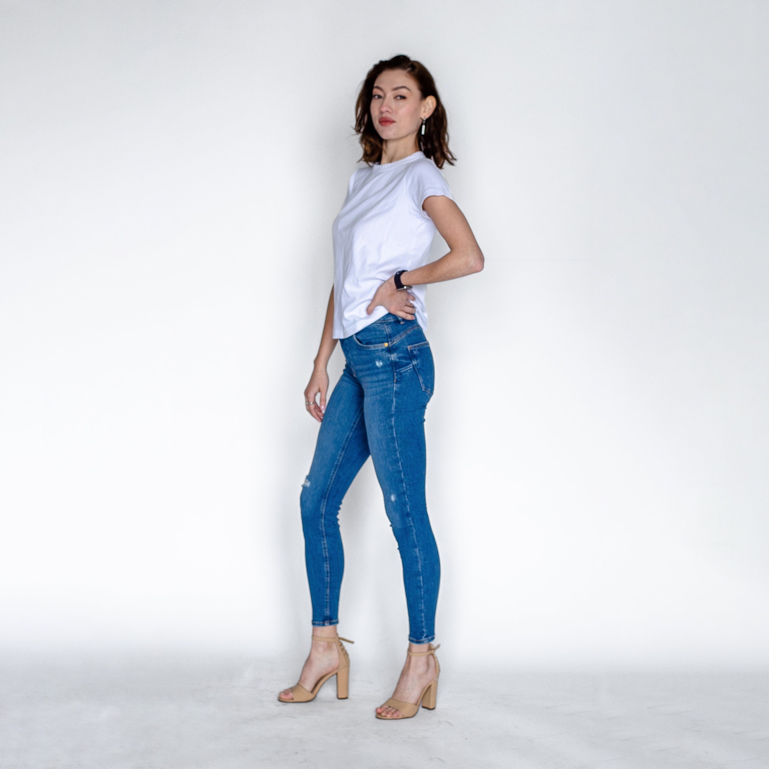 Add a touch of effortless cool to your look with these medium wash, high-waisted skinny jeans. Featuring a subtle distressed detail and a stylish ripped knee, these jeans are a perfect blend of edgy and classic. The soft, stretchy denim provides a flattering and comfortable fit that will make them your new go-to pair.