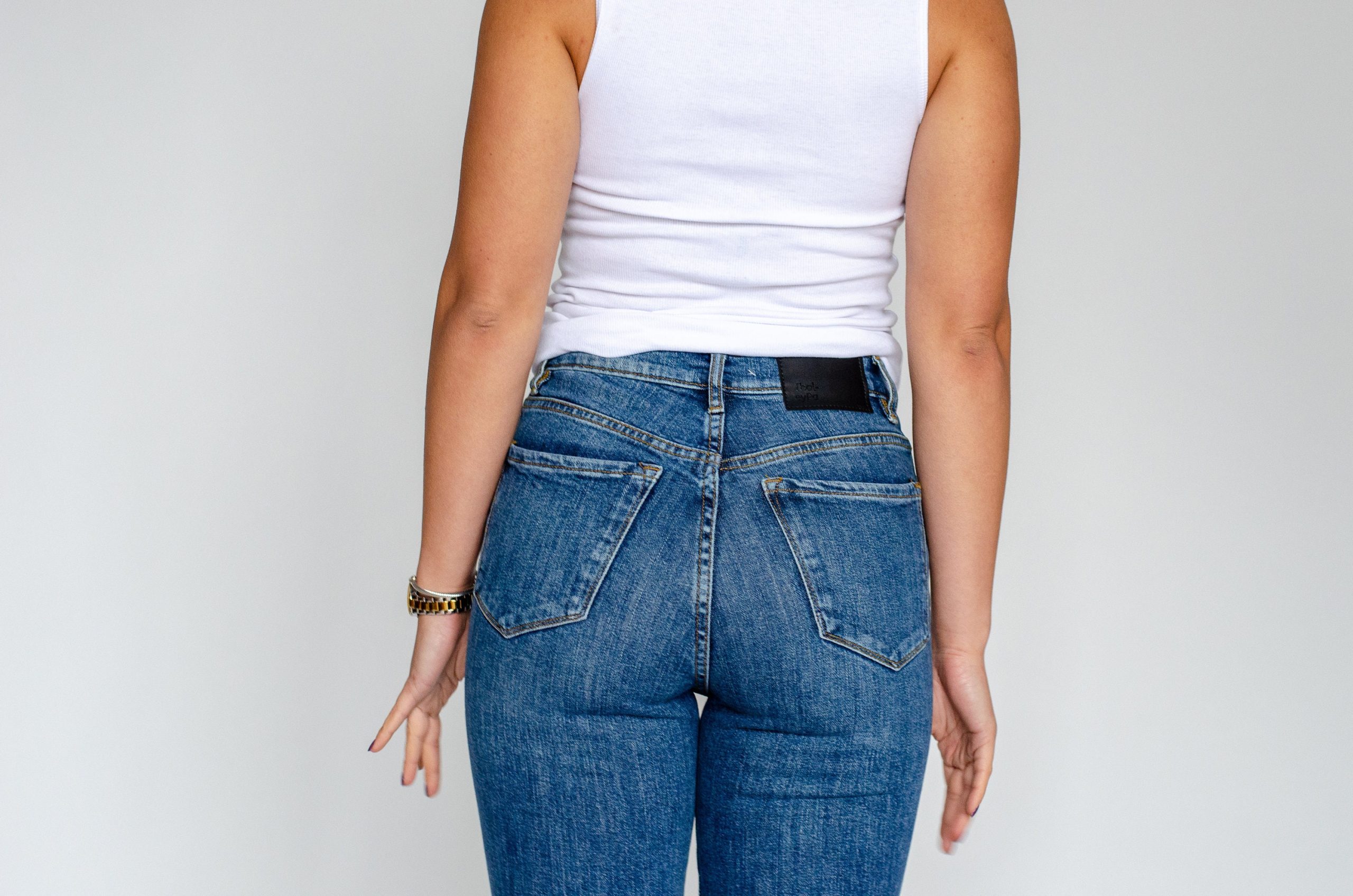 A pair of stretch-denim jeans featuring a mini flare, ankle length, high rise, five-pocket construction, frayed trim, belt loops, front zip, and metal button closure.